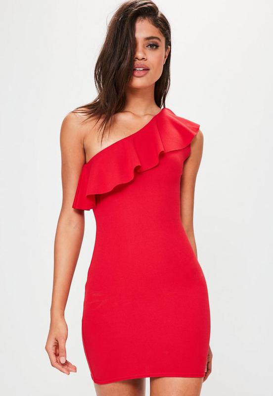 Платье на одно плечо с воланом. Красное платье на одно плечо с воланом. Праздничные платья на одно плечо