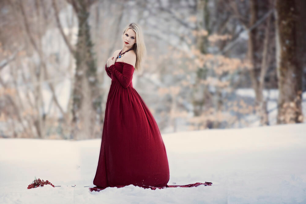 Фотосессия зимой в платье. Красное платье. Девушка в платье. Девушка в длинном платье зима